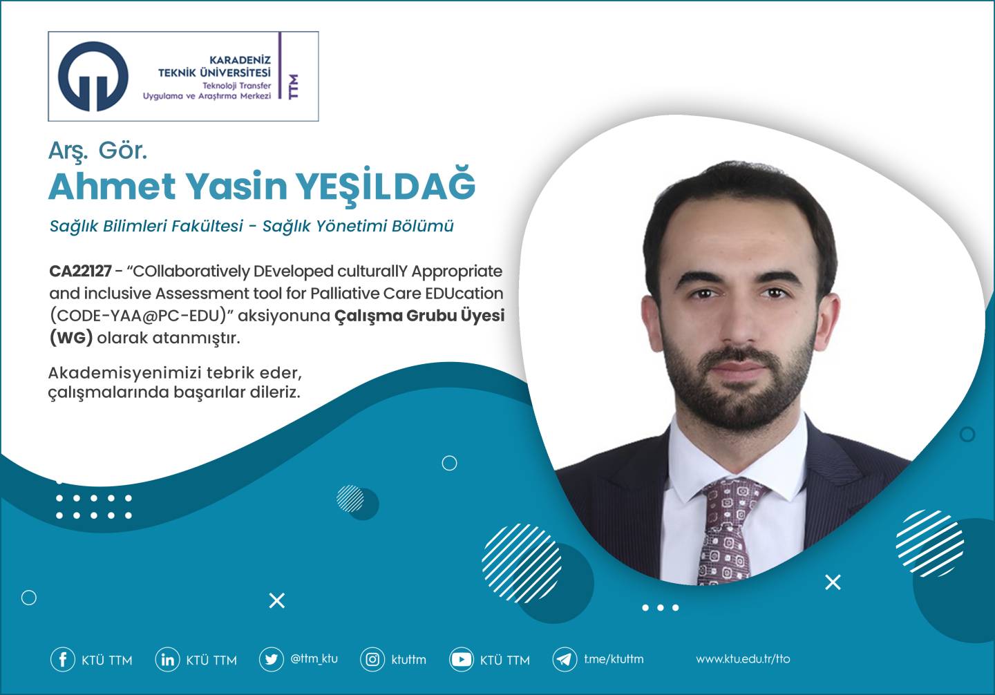 Üniversitemiz Sağlık Bilimleri Fakültesi Sağlık Yönetimi Bölümü öğretim elemanı Arş. Gör. Ahmet Yasin YEŞİLDAĞ, COST Programı’nın “CA22127 - COllaboratively DEveloped culturallY Appropriate and inclusive Assessment tool for Palliative Care EDUcation (CODE-YAA@PC-EDU)” aksiyonuna Çalışma Grubu Üyesi (WG) olarak atanmıştır.