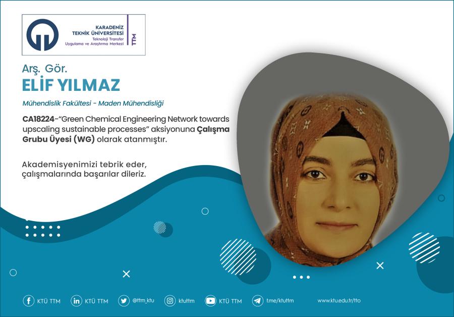 Üniversitemiz Mühendislik Fakültesi Maden Mühendisliği Bölümü öğretim elemanı Arş. Gör. ELİF YILMAZ, COST Programı’nın “CA18224 - Green Chemical Engineering Network towards upscaling sustainable processes” aksiyonuna Çalışma Grubu Üyesi (WG) olarak atanmıştır.