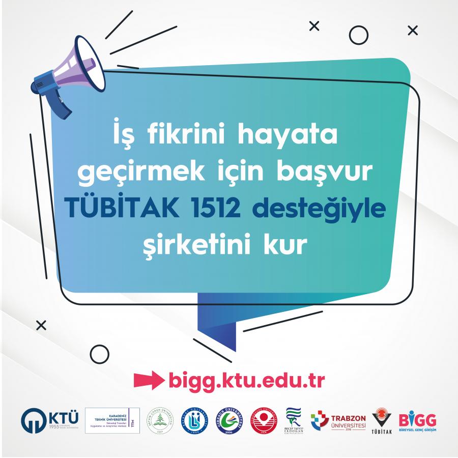 Teknolojik ve yenilik odaklı iş fikirlerinin desteklendiği TÜBİTAK 1512 Girişimcilik Destek Programı ile şirket kurma fırsatı yakalamak için hemen başvur: bigg.ktu.edu.tr