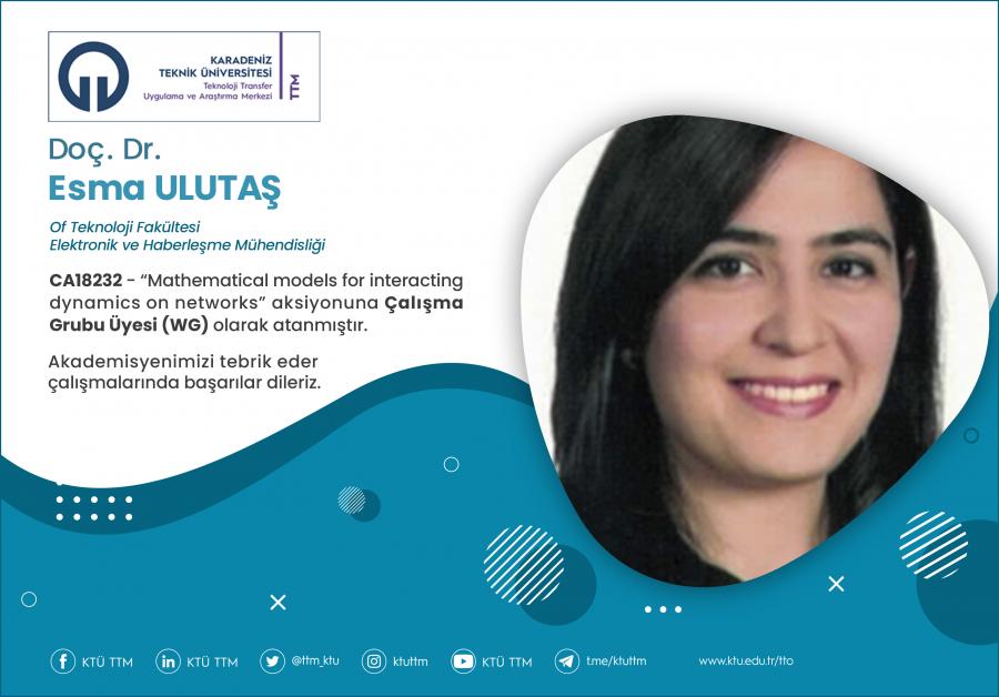 Üniversitemiz Of Teknoloji Fakültesi Elektronik ve Haberleşme Mühendisliği Bölümü öğretim üyesi Doç. Dr. Esma ULUTAŞ, COST Programı’nın “CA18232 - Mathematical models for interacting dynamics on networks” aksiyonuna Çalışma Grubu Üyesi (WG) olarak atanmıştır.