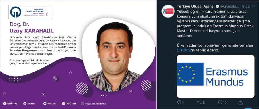 Üniversitemiz Orman Fakültesi Orman Müh. bölümü öğretim üyelerinden Doç. Dr. Uzay KARAHALİL'in üniversitemizi temsil ettiği ve KTÜ'nün proje ortağı olarak yer aldığı; uluslararası fon destekli Erasmus Mundus Programına sunulan proje başvurusu desteklenmeye hak kazanmıştır.