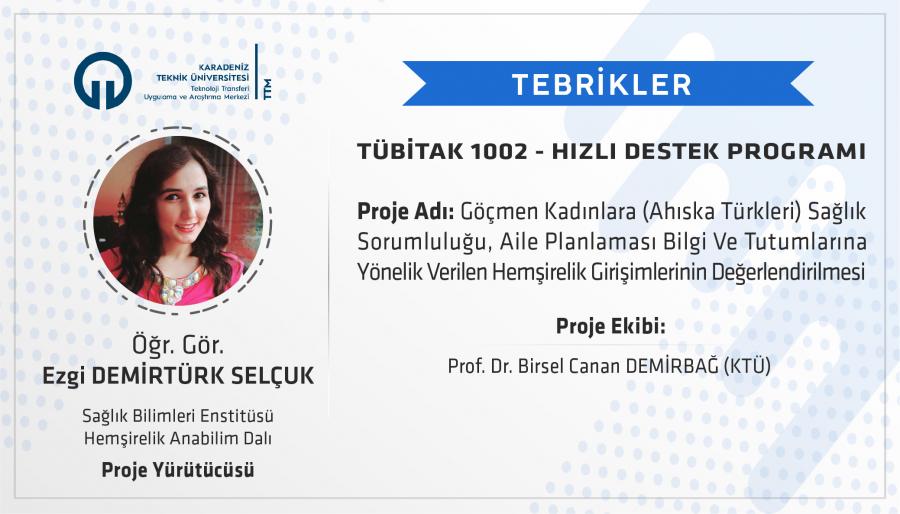 Üniversitemiz Sağlık Bilimleri Enstitüsü Hemşirelik A.D. doktora öğrencisi Öğr. Gör. Ezgi DEMİRTÜRK SELÇUK’uın "Göçmen Kadınlara (Ahıska Türkleri) Sağlık Sorumluluğu, Aile Planlaması Bilgi ve Tutumlarına Yönelik Verilen Hemşirelik Girişimlerinin Değerlendirilmesi” başlıklı projesi, TÜBİTAK 1002 Hızlı Destek Programı kapsamında desteklenmiştir.