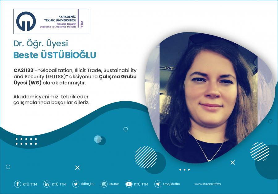 Üniversitemiz Mühendislik Fakültesi Bilgisayar Mühendisliği Bölümü öğretim üyesi Dr. Öğr. Üyesi Beste ÜSTÜBİOĞLU, COST Programı’nın “CA21133 - Globalization, Illicit Trade, Sustainability and Security (GLITSS)” aksiyonuna Çalışma Grubu Üyesi (WG) olarak atanmıştır.