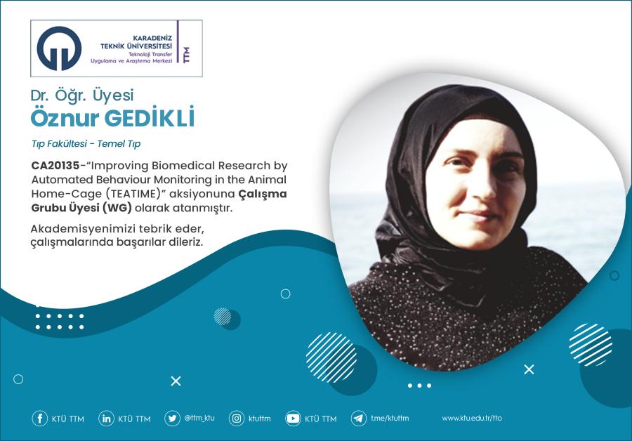 Üniversitemiz Tıp Fakültesi Temel Tıp Bölümü öğretim üyesi Dr. Öğr. Üyesi Öznur GEDİKLİ, COST Programı’nın “CA20135-Improving Biomedical Research by Automated Behaviour Monitoring in the Animal Home-Cage (TEATIME)” aksiyonuna Çalışma Grubu Üyesi (WG) olarak atanmıştır.