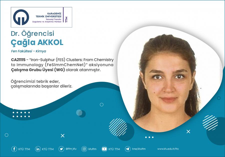 Üniversitemiz Fen Fakültesi Kimya Bölümü Dr. Öğrencisi Çağla AKKOL, COST Programı’nın “CA21115 - Iron-Sulphur (FES) Clusters: From Chemistry to Immunology (FeSlmmChemNet)” aksiyonuna Çalışma Grubu Üyesi (WG) olarak atanmıştır.