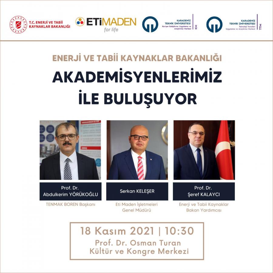T.C. Enerji ve Tabii Kaynaklar Bakanlığı, Enerji ve Tabii Kaynaklar Bakan Yardımcısı Prof. Dr. Şeref KALAYCI, TENMAK BOREN Başkanı Prof. Dr. Abdülkerim YÖRÜKOĞLU ve Eti Maden İşletmeleri Genel Müdürü Serkan KELEŞER’in katılımlarıyla 18 Kasım 2021 saat 10.30’da Prof. Dr. Osman Turan Kültür ve Kongre Merkezi’nde Karadeniz Teknik Üniversitesi akademisyenleri ile buluşacaktır. Tüm akademisyenlerimiz davetlidir.