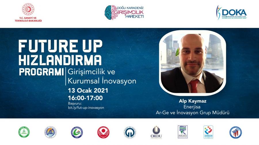 KTÜ Teknoloji Transferi Uygulama ve Araştırma Merkezi, Doğu Karadeniz Kalkınma Ajansı (DOKA), Doğu Karadeniz Bölgesi Üniversiteleri ve Teknokentleri işbirliğinde düzenlenen FutureUp Hızlandırma Programı kapsamında Enerjisa Ar-Ge ve İnovasyon Grup Müdürü Sayın Alp Kaymaz'ın katılımıyla Kurumsal İnovasyon teması üzerine bugün 16:00-17:00 saatleri arasında bir söyleşi programı düzenlenecektir. Söyleşi programına aşağıdaki linkten katılım sağlayabilirsiniz.