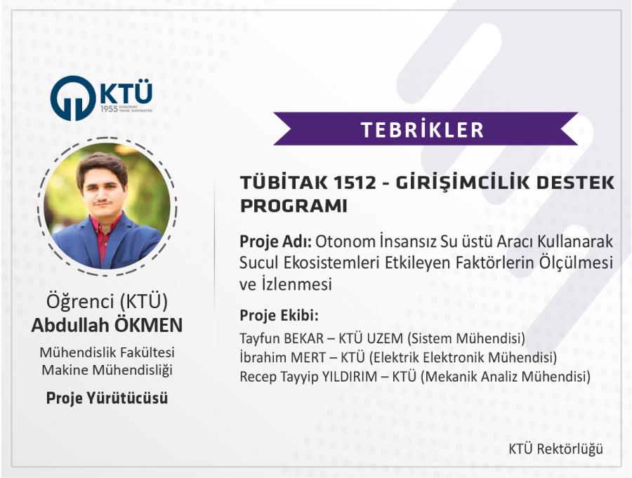 Üniversitemiz Mühendislik Fakültesi, Makine Mühendisliği Bölümü lisans öğrencilerinden Abdullah ÖKMEN’in, “Otonom İnsansız Su üstü Aracı Kullanarak Sucul Ekosistemleri Etkileyen Faktörlerin Ölçülmesi ve İzlenmesi” başlıklı projesi, TÜBİTAK 1512 Girişimcilik Destek Programı (BİGG) kapsamında desteklendi.
