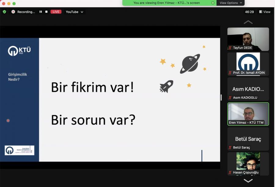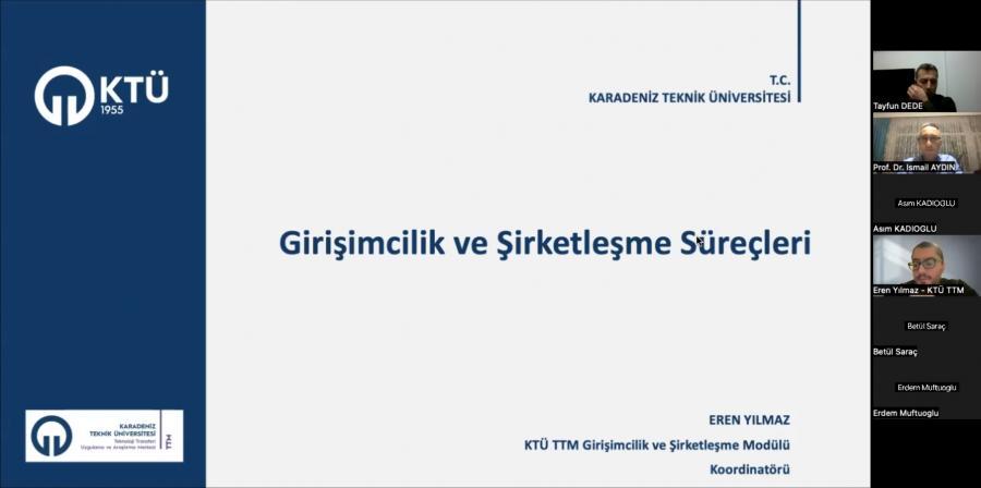 KTÜ TTM Şirketleşme ve Girişimcilik Modülü tarafından KTÜ Fen Bilimleri Enstitüsü lisansüstü öğrencilerine yönelik çevrim içi eğitim düzenlendi. Etkinlikte; teknoloji girişimciliği, girişimci düşünce yapısı, değer önerisi, iş fikri doğrulama yöntemleri ve TÜBİTAK 1512 BİGG program konuları anlatıldı. Etkinlik KTÜ FBE Youtube kanalında canlı yayınlandı.