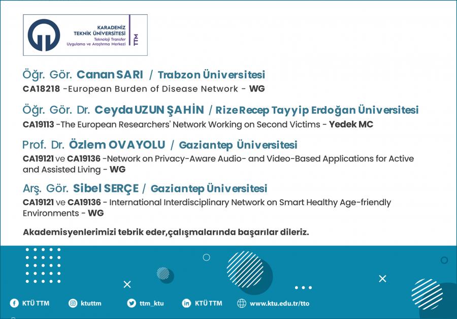 Bu doğrultuda aşağıda belirtilen Değerli Üniversitelerimizin Akademisyenleri KTÜ Teknoloji Transferi Uygulama ve Araştırma Merkezi’nin ve TÜBİTAK'ın desteğiyle birlikte COST Programı’na atanmışlardır.