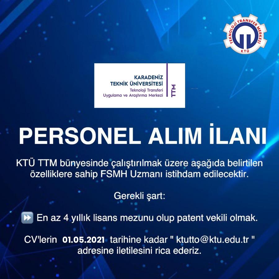 KTÜ TTM bünyesinde çalıştırılmak üzere aşağıda belirtilen özelliklere sahip FSMH Uzmanı istihdam edilecektir.