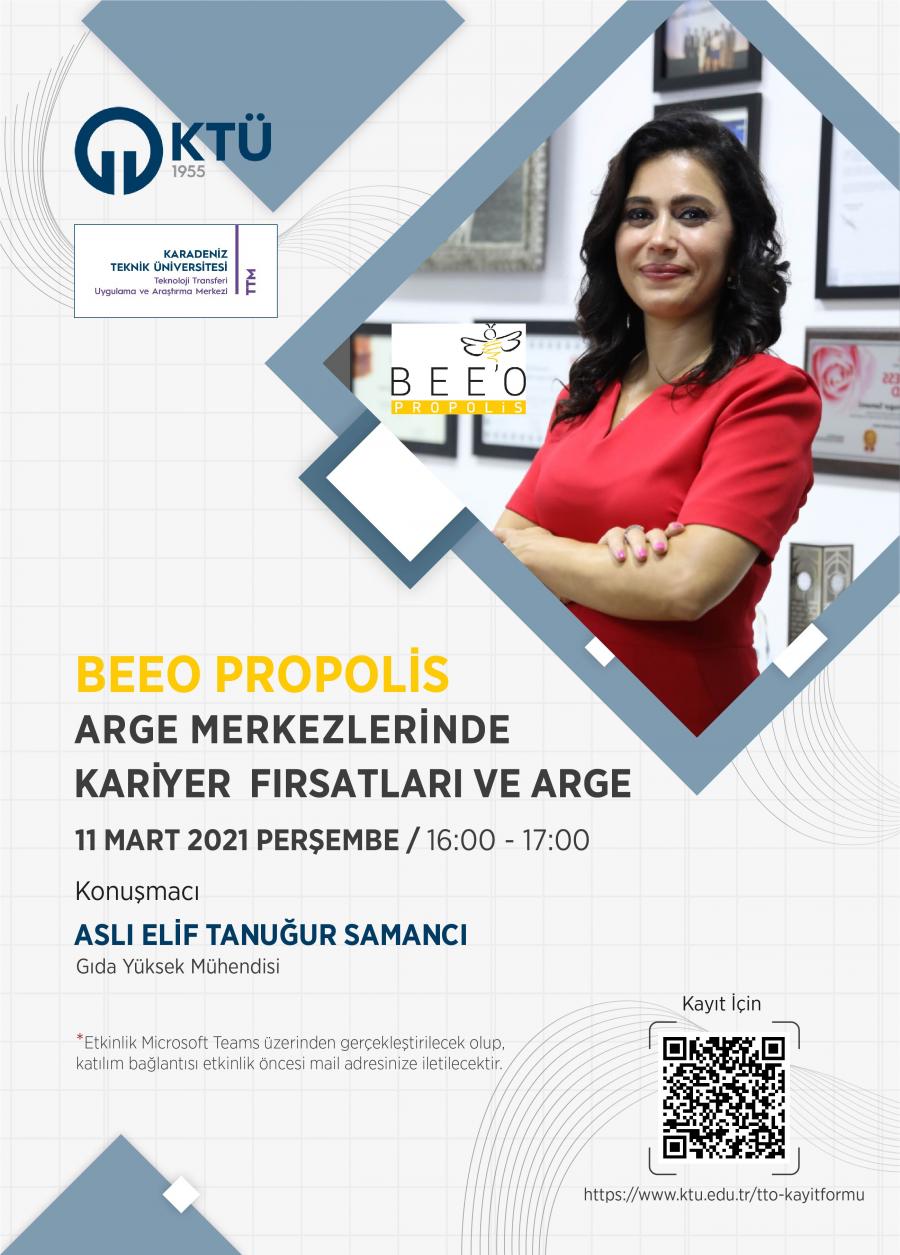 "BEEO Propolis Ar-Ge Merkezlerinde Kariyer Fırsatları ve Ar-Ge" isimli etkinlik 11 Mart 2021 Perşembe günü saat 16:00' da Microsft Teams uygulaması üzerinden gerçekleştirilecektir. Kayıt formuna afiş üzerinde yer alan karekod veya