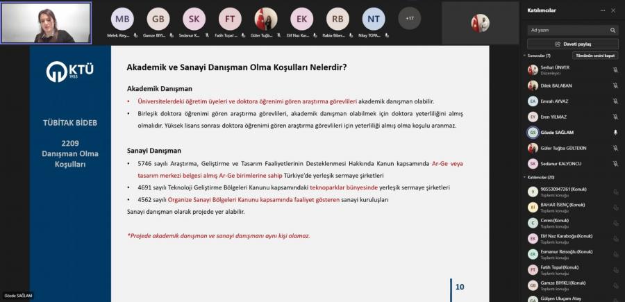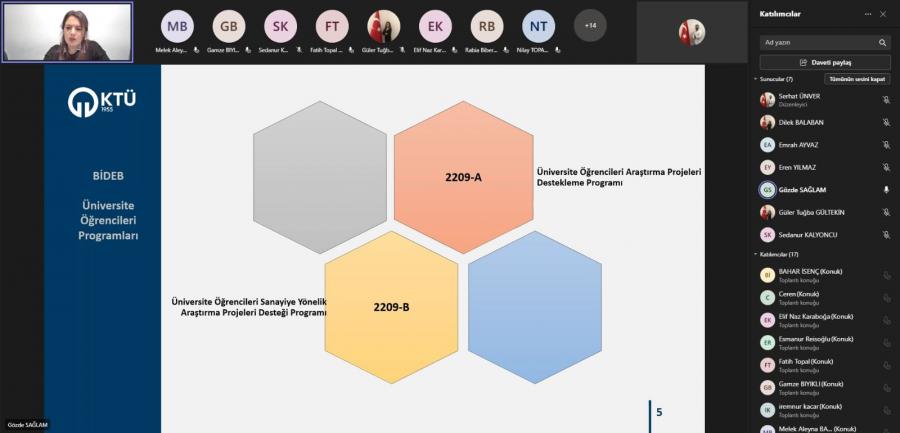 KTÜ Teknoloji Transferi Uygulama ve Araştırma Merkezi tarafından KTÜ önlisans öğrencilerine yönelik “TÜBİTAK Önlisans Öğrencileri Araştırma Projeleri Bilgilendirme Etkinliği” Öğr. Gör. Gözde SAĞLAM tarafından 04.11.2022 tarihinde çevrim içi olarak gerçekleştirilmiştir. Etkinlikte önlisans öğrencilerinin başvuru yapabileceği TÜBİTAK 2209 Programlarının başvuru koşullarının ve detaylarının yanı sıra faydalanabilecekleri diğer programlarında detayları paylaşılmıştır.