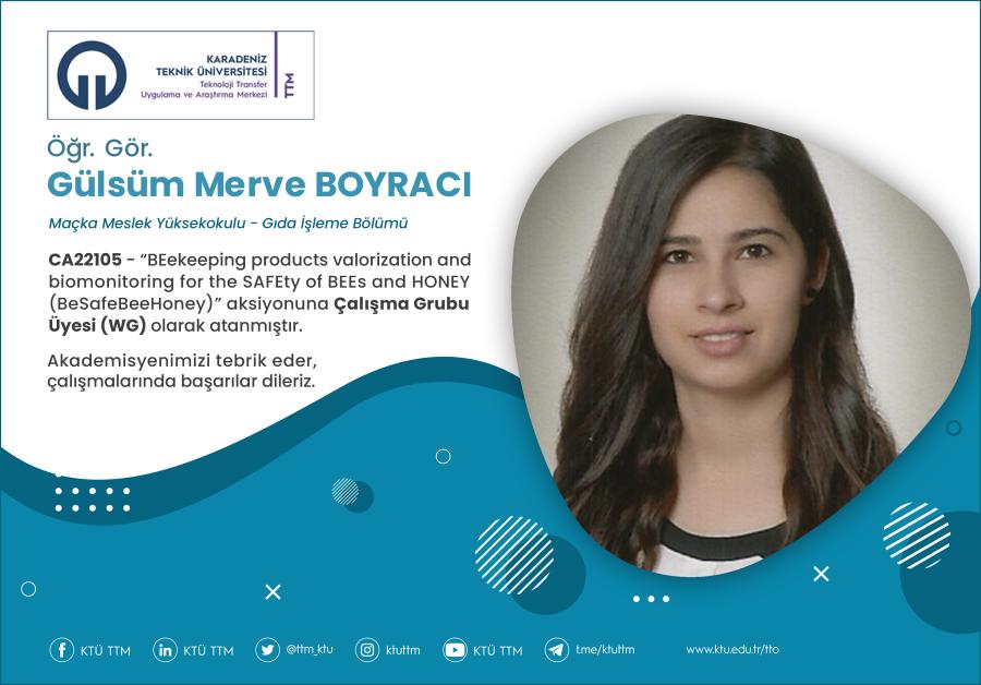 Üniversitemiz Maçka Meslek Yüksekokulu Gıda İşleme Bölümü öğretim elemanı Öğr. Gör. Gülsüm Merve BOYRACI, COST Programı’nın “CA22105 - BEekeeping products valorization and biomonitoring for the SAFEty of BEEs and HONEY (BeSafeBeeHoney)” aksiyonuna Çalışma Grubu Üyesi (WG) olarak atanmıştır.