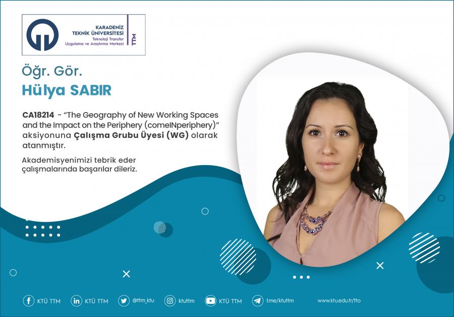 Üniversitemiz Teknoloji Transferi Uygulama ve Araştırma Merkezi (KTÜ TTM) öğretim elemanı Öğr. Gör. Hülya SABIR, COST Programı’nın “CA18214 - The Geography of New Working Spaces and the Impact on the Periphery (comeINperiphery)” aksiyonuna Çalışma Grubu Üyesi (WG) olarak atanmıştır.