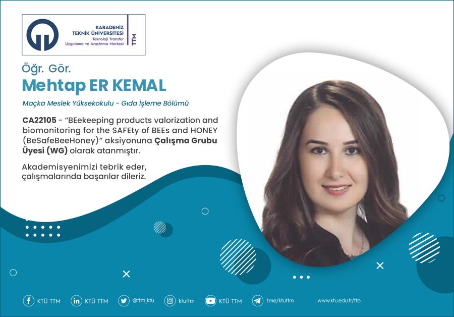 Üniversitemiz Maçka Meslek Yüksekokulu Gıda İşleme Bölümü öğretim elemanı Öğr. Gör. Mehtap ER KEMAL, COST Programı’nın “CA22105 - BEekeeping products valorization and biomonitoring for the SAFEty of BEEs and HONEY (BeSafeBeeHoney)” aksiyonuna Çalışma Grubu Üyesi (WG) olarak atanmıştır.