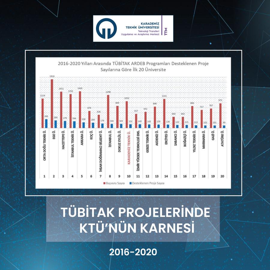 Karadeniz Teknik Üniversitesi 2016-2020 yılları arasında TÜBİTAK ARDEB programları kapsamında 152 proje ile Türkiye'deki üniversiteler arasında 10. sırada, devlet üniversiteleri arasında 8. sırada ve bölge üniversiteleri arasında ise 1. sırada yer almıştır. Ayrıca son beş yılda KTÜ, TÜBİTAK ARDEB programlarına 1052 proje başvurusu yaparak Türkiye’deki üniversiteler arasında 8. sırada ve bölge üniversiteleri arasında 1. sırada yer almıştır.