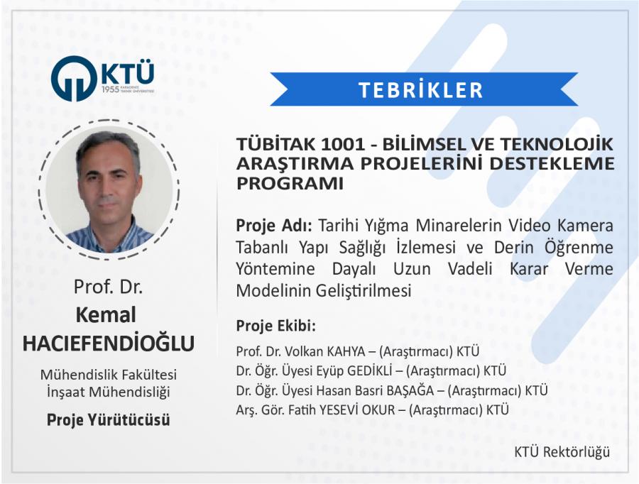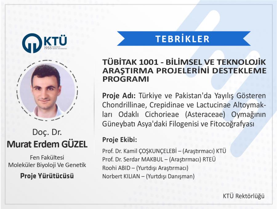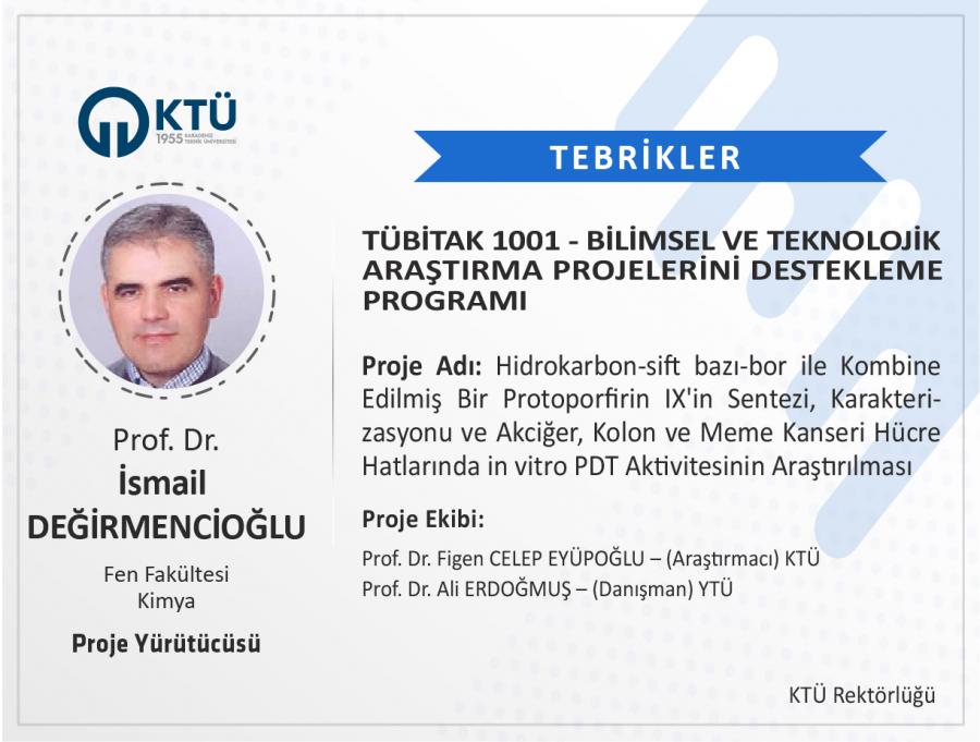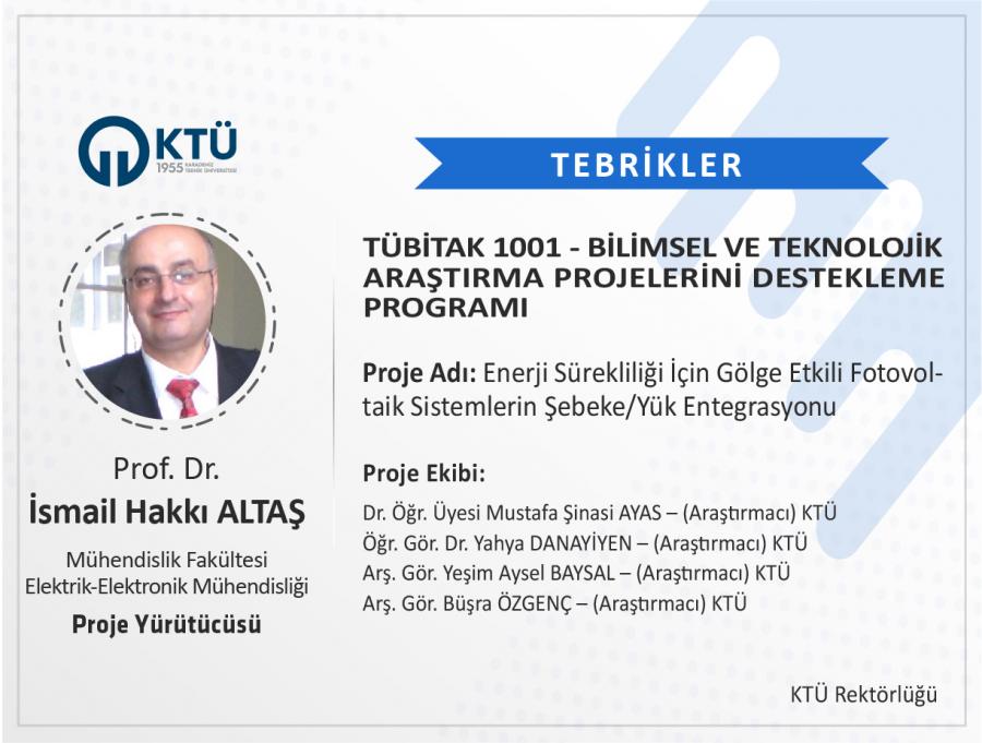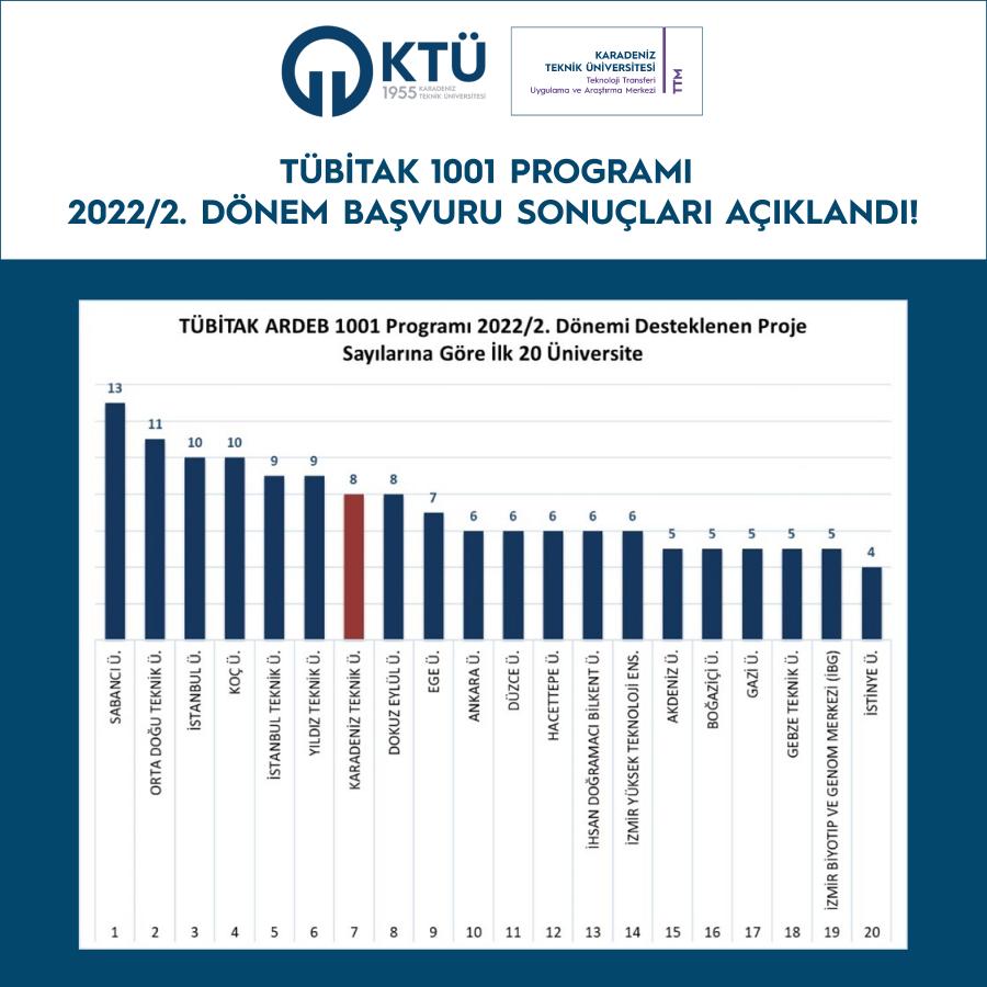 TÜBİTAK "1001-Bilimsel ve Teknolojik Araştırma Projelerini Destekleme Programı” kapsamında 2022 yılı 2. Dönemi’nde toplamda 1351 proje bilimsel değerlendirmeye alınmış, bu projelerin 240’ı desteklenmiş ve programın bu dönem için desteklenme oranı % 17,76 olmuştur. Üniversitemizden 32 proje başvurusunda bulunulmuş ve desteklenmeye hak kazanan 8 projeyle KTÜ; projeleri desteklenen 89 üniversite arasında 7. sırada yer almış ve % 25 desteklenme oranı ile ortalamanın üzerinde yer almıştır. Üniversitemizden yapılan 3 proje önerisinin ise bir sonraki dönemi beklemeden başvuru yapılabilmesine karar verilmiştir.