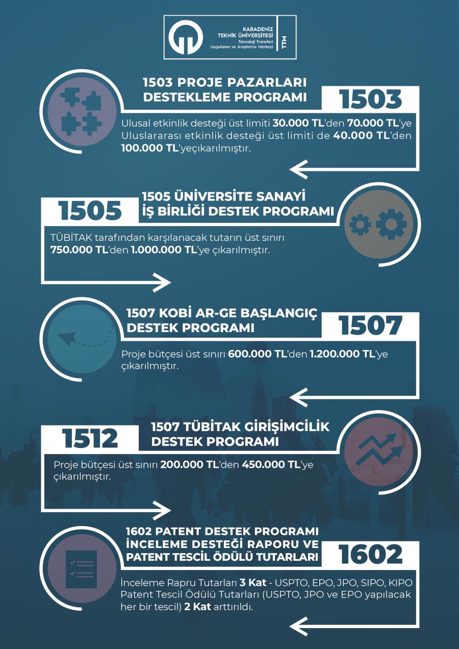 TÜBİTAK Teknoloji ve Yenilik Destek Programları Başkanlığı (TEYDEB) tarafından yürütülen programların destek üst limitleri artırıldı. BİGG ve KOBİ Ar-Ge Başlangıç programının dışında Proje Pazarları Destekleme Programı ulusal etkinlik desteği üst limiti 30 bin TL’den 70 bin TL’ye ve uluslararası etkinlik desteği üst limiti de 40 bin TL’den 100 bin TL’ye çıkarıldı. Üniversite-Sanayi İş birliği Destek Programında TÜBİTAK tarafından karşılanacak tutarın üst sınırı 750 bin TL’den 1 milyon TL’ye yükseltildi. Patent Destek Programı İnceleme Raporu Desteği ve Patent Tescil Ödülü tutarları da yukarı yönlü revize edildi. Yeni üst limitler, 21 Nisan 2022 tarihinden sonra açılan çağrılara yapılan proje başvurularında uygulanacak.