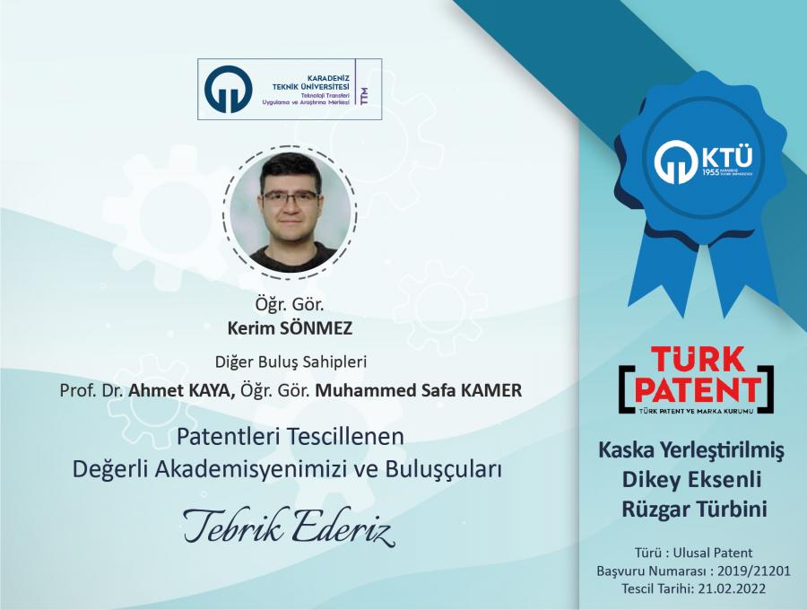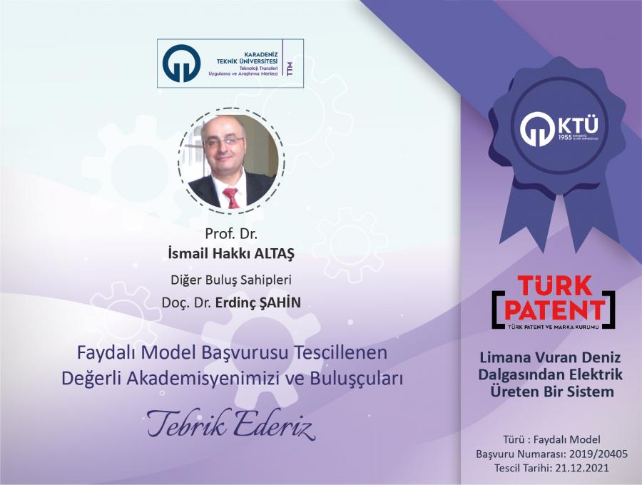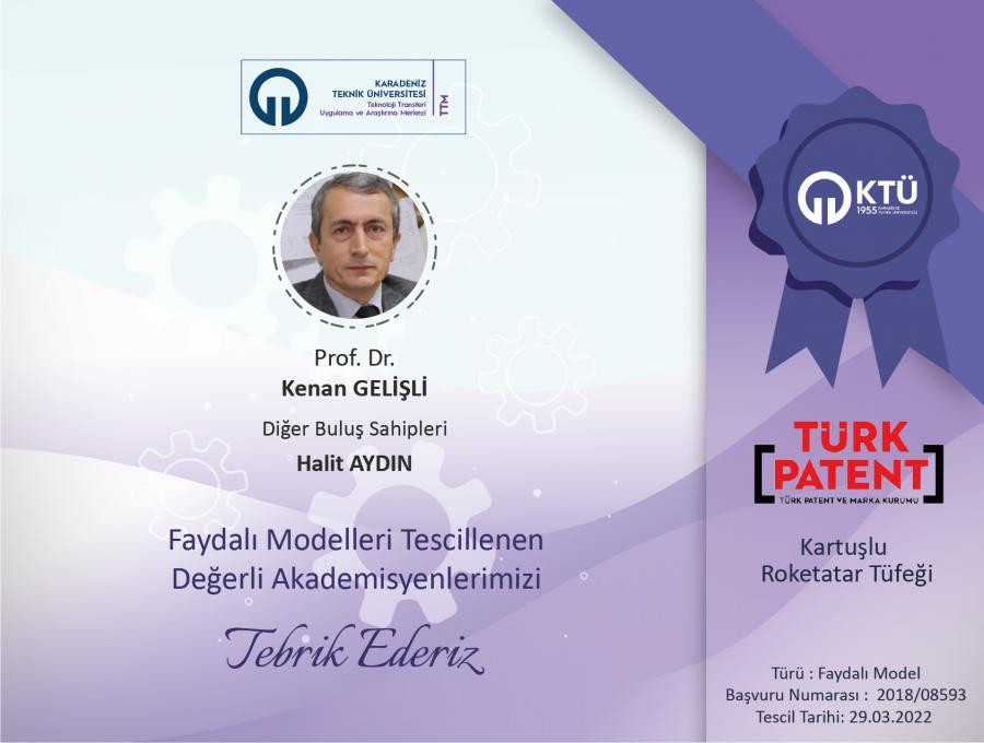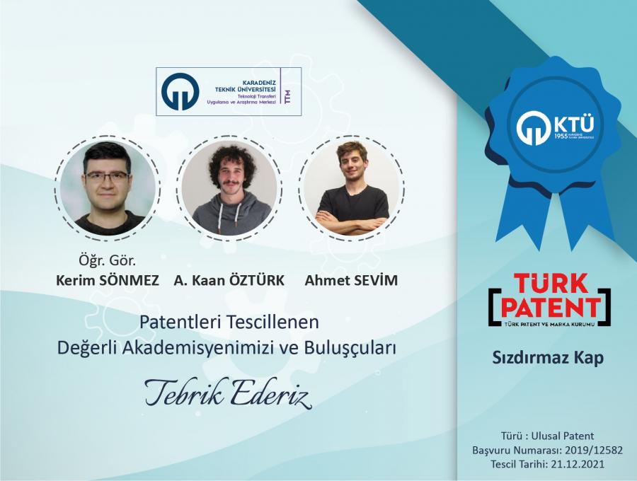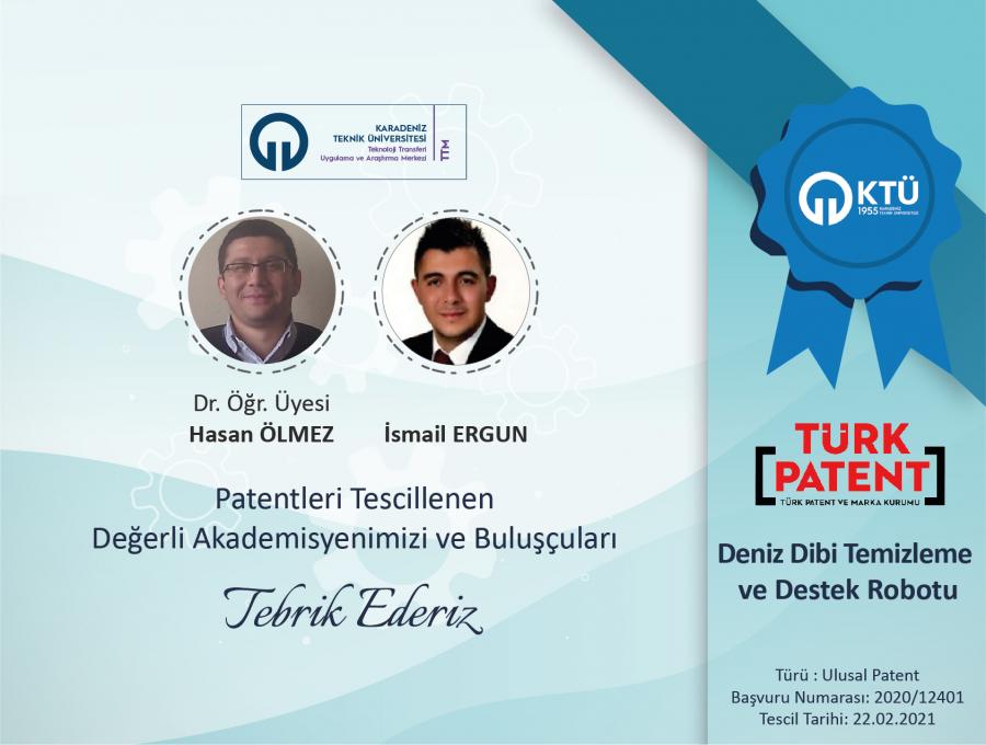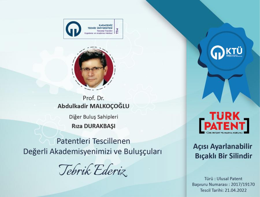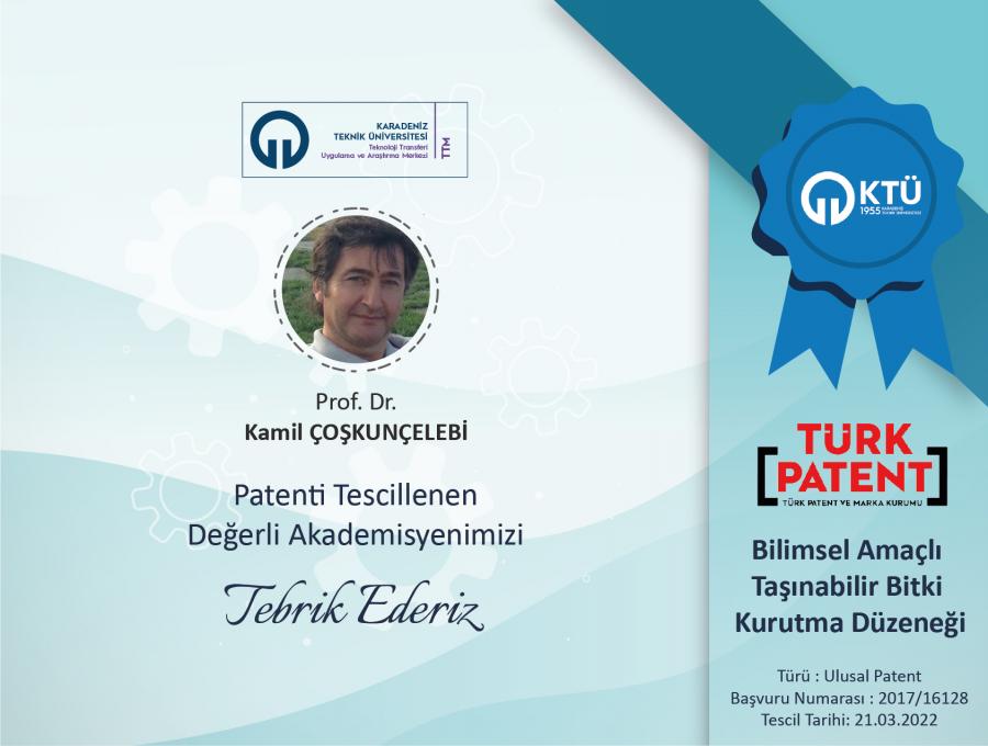 Karadeniz Teknik Üniversitesi mensubu akademisyenlerimizin Ulusal Patent ve Faydalı Model başvuruları Türk Patent ve Marka Kurumu tarafından tescil edilmiştir. 2021 yılının son çeyreği ve 2022 yılı içinde tescil alan akademisyenlerimizi ve buluşçuları özverili çalışmalarından dolayı tebrik eder, başarılarının devamını dileriz. KTÜ ekolüne yapmış oldukları katkılardan dolayı teşekkür ederiz.