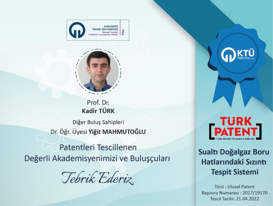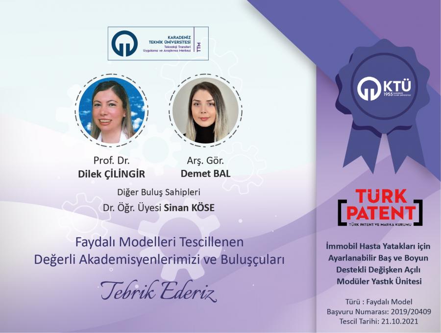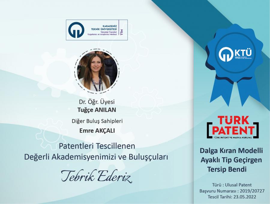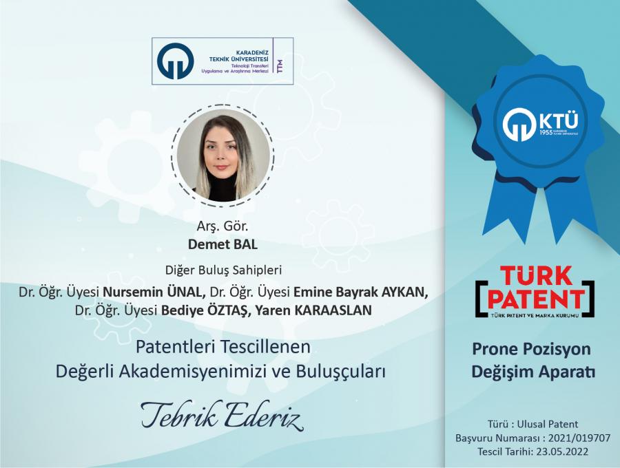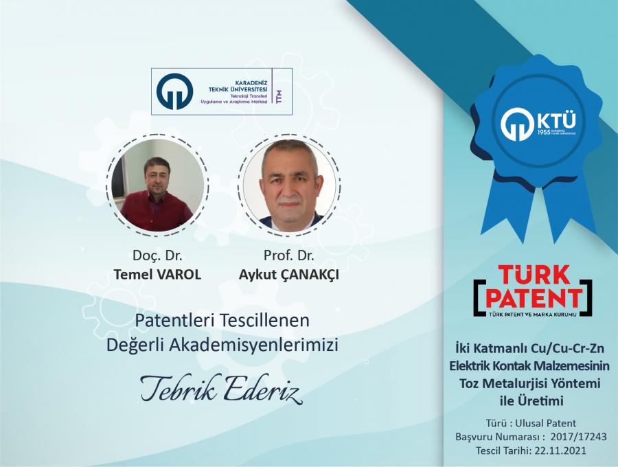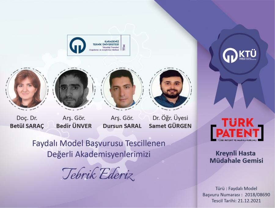 Karadeniz Teknik Üniversitesi mensubu akademisyenlerimizin Ulusal Patent ve Faydalı Model başvuruları Türk Patent ve Marka Kurumu tarafından tescil edilmiştir. 2021 yılının son çeyreği ve 2022 yılı içinde tescil alan akademisyenlerimizi ve buluşçuları özverili çalışmalarından dolayı tebrik eder, başarılarının devamını dileriz. KTÜ ekolüne yapmış oldukları katkılardan dolayı teşekkür ederiz.
