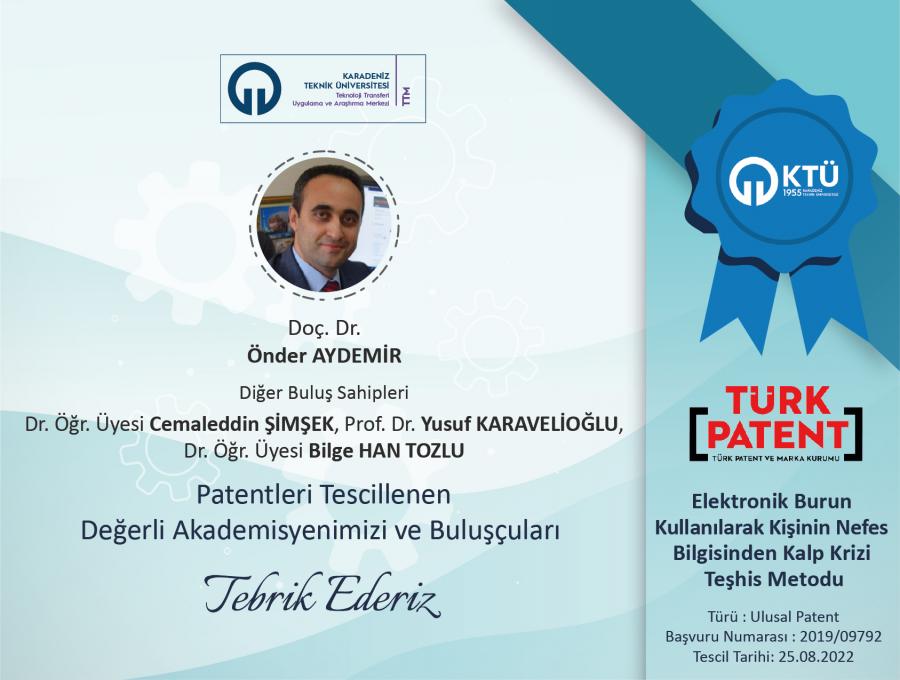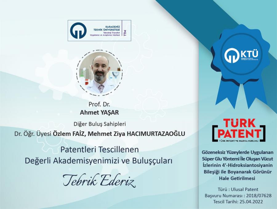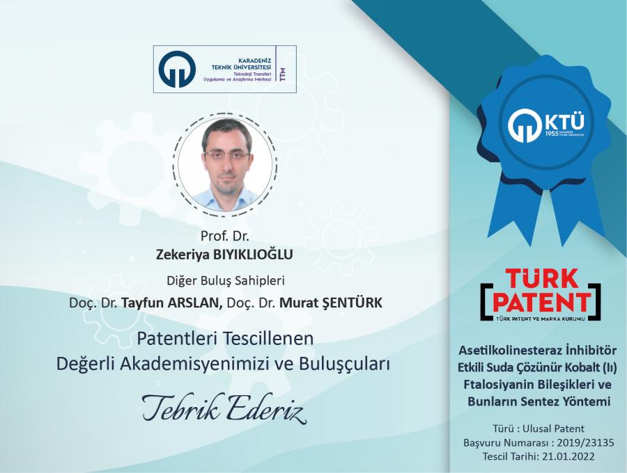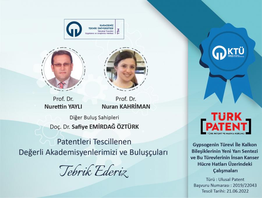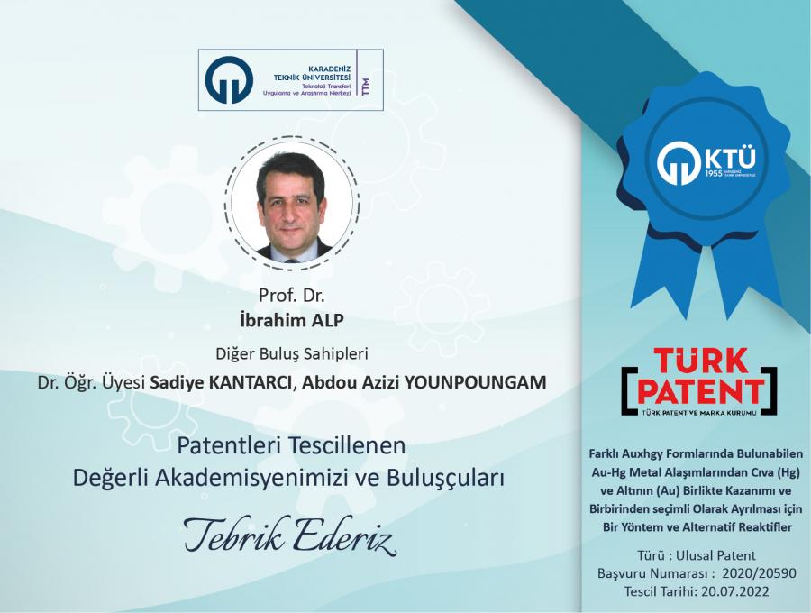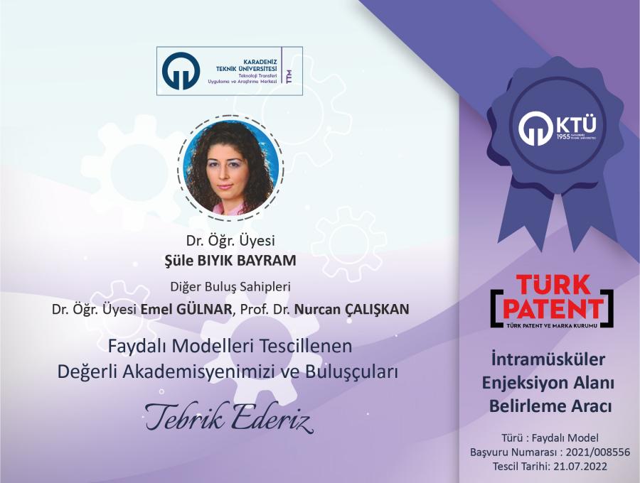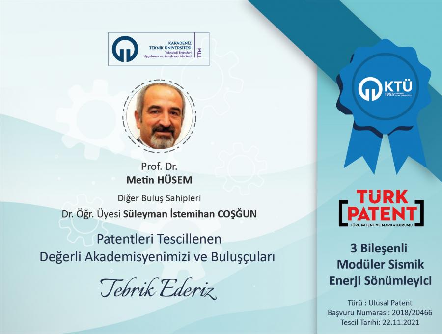 Karadeniz Teknik Üniversitesi mensubu akademisyenlerimizin Ulusal Patent ve Faydalı Model başvuruları Türk Patent ve Marka Kurumu tarafından tescil edilmiştir. 2021 yılının son çeyreği ve 2022 yılı içinde tescil alan akademisyenlerimizi ve buluşçuları özverili çalışmalarından dolayı tebrik eder, başarılarının devamını dileriz. KTÜ ekolüne yapmış oldukları katkılardan dolayı teşekkür ederiz.