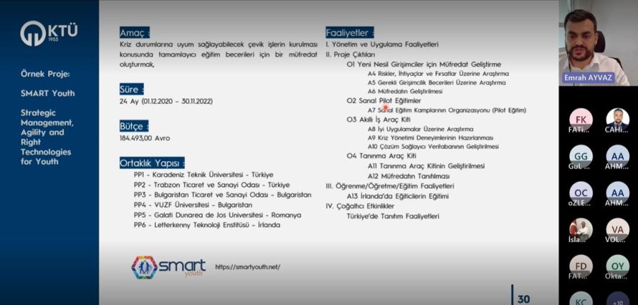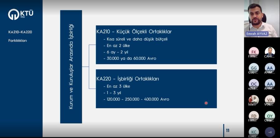 KTÜ TTM organizasyonuyla düzenlenen ‘‘Erasmus+ KA2- Kurum ve Kuruluşlar Arasında İş Birliği Projeleri (KA210 ve KA220) Bilgilendirme Toplantısı’’ Öğr. Gör. Emrah AYVAZ tarafından Üniversitemiz araştırmacılarına yönelik çevrim içi olarak gerçekleştirildi.