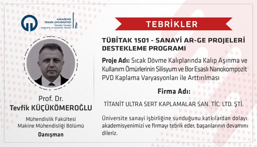 Titanit Ultra Sert Kaplamalar San. Tic. Ltd. Şti. firmasının yürütücü olduğu ve üniversitemiz araştırmacılarından Prof. Dr. Tevfik KÜÇÜKÖMEROĞLU’nun danışman olarak yer aldığı TÜBİTAK 1501 Sanayi Ar-Ge Projeleri Destekleme Programı Çağrısına sunulan "Sıcak Dövme Kalıplarında Kalıp Aşınma ve Kullanım Ömürlerinin Silisyum ve Bor Esaslı Nanokompozit PVD Kaplama Varyasyonları ile Arttırılması" projesi destek almaya hak kazanmıştır.
