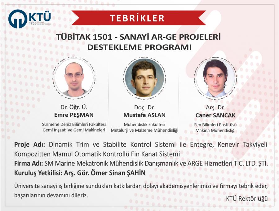 SM Marine Mekatronik Mühendislik Danışmanlık ve ARGE Hizmetleri TİC. LTD. ŞTİ. firmasının yürütücü olduğu ve Üniversitemiz araştırmacılarından Doç. Dr. Mustafa ASLAN, Dr. Öğr. Üyesi Emre PEŞMAN ve Arş. Gör. Caner SANCAK‘ın araştırmacı olarak yer aldığı TÜBİTAK 1501 Sanayi Ar-Ge Projeleri Destekleme Programı Çağrısı'na sunulan "Dinamik Trim ve Stabilite Kontrol Sistemi ile Entegre, Kenevir Takviyeli Kompozitten Mamul Otomatik Kontrollü Fin Kanat Sistemi" başlıklı projesi destek almaya hak kazanmıştır.