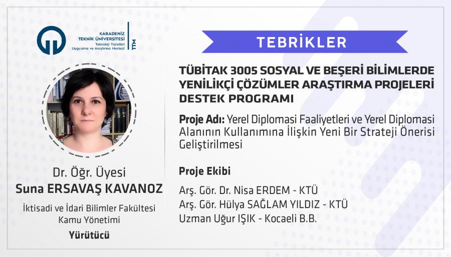 Üniversitemiz İktisadi ve İdari Bilimler Fakültesi (İİBF) Kamu Yönetimi Bölümü Öğretim üyelerinden Dr. Öğr. Üyesi Suna ERSAVAŞ KAVANOZ’un “Yerel Diplomasi Faaliyetleri ve Yerel Diplomasi Alanının Kullanımına İlişkin Yeni Bir Strateji önerisi Geliştirilmesi” başlıklı projesi TÜBİTAK 3005 Programı kapsamında desteklendi.