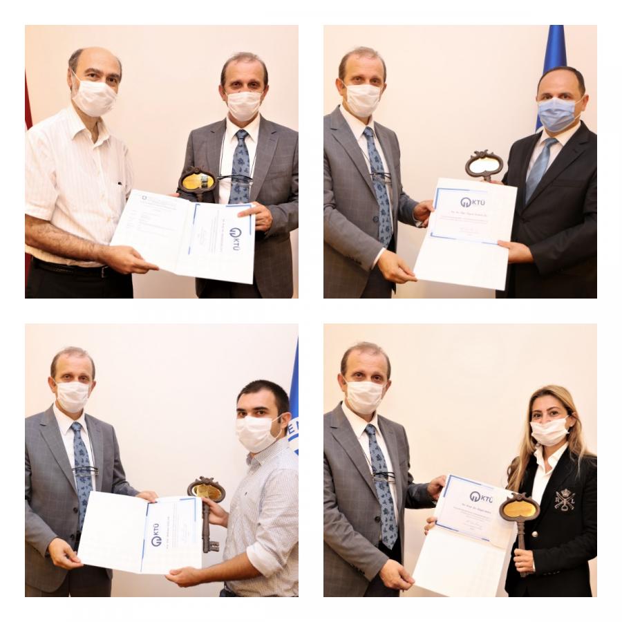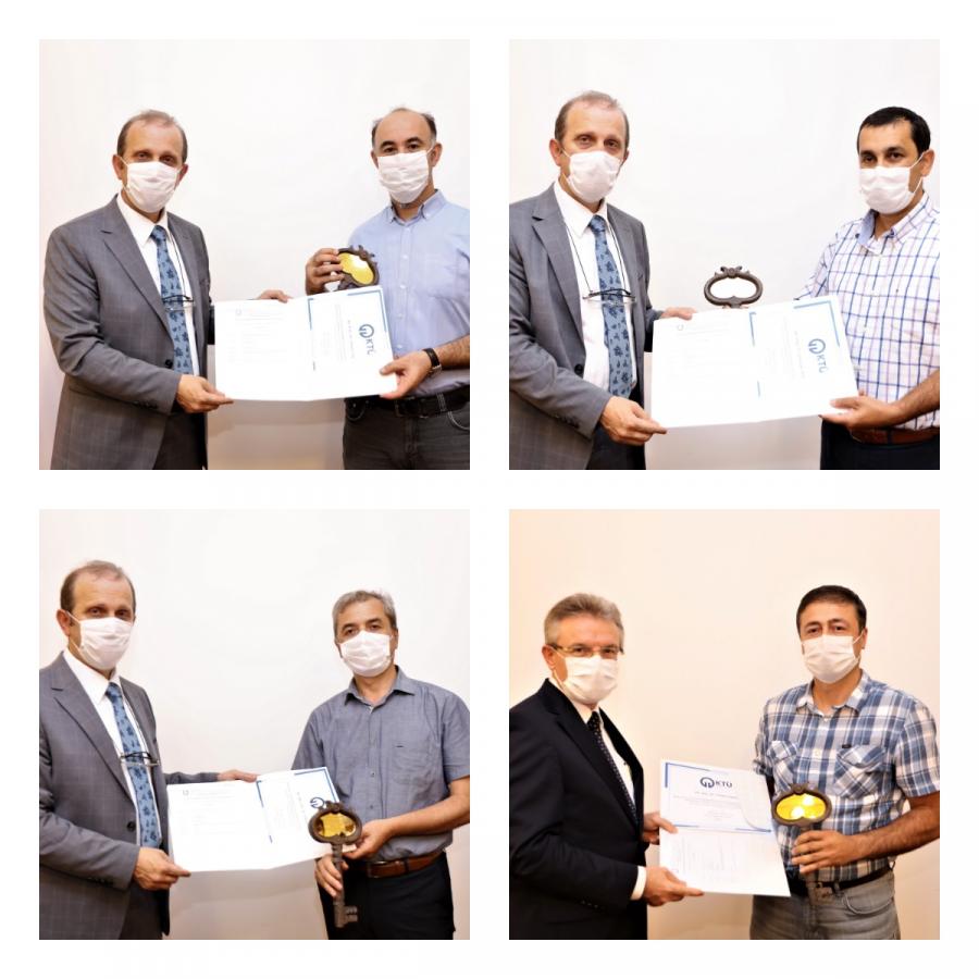Üniversitemiz Bünyesinde 2020 yılında Fikri Sınai Mülkiyet Hakları kapsamında tescillenen ulusal ve uluslararası patentler için KTÜ Rektörlüğü tarafından tebrik töreni düzenlendi. Törende, rektörümüz Prof. Dr. Hamdullah ÇUVALCI tescil alan akademisyenlerimize tebrik belgelerini ve günün anısı adına şilt takdim etti.
