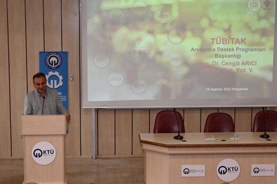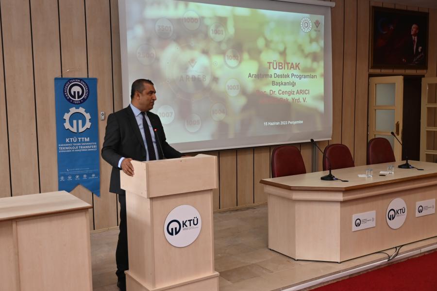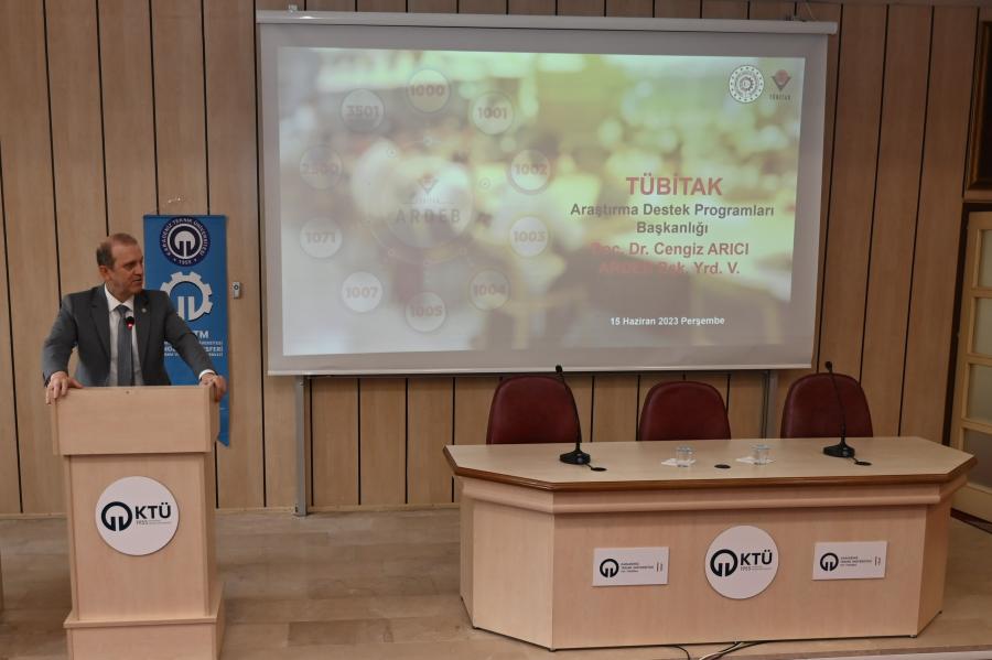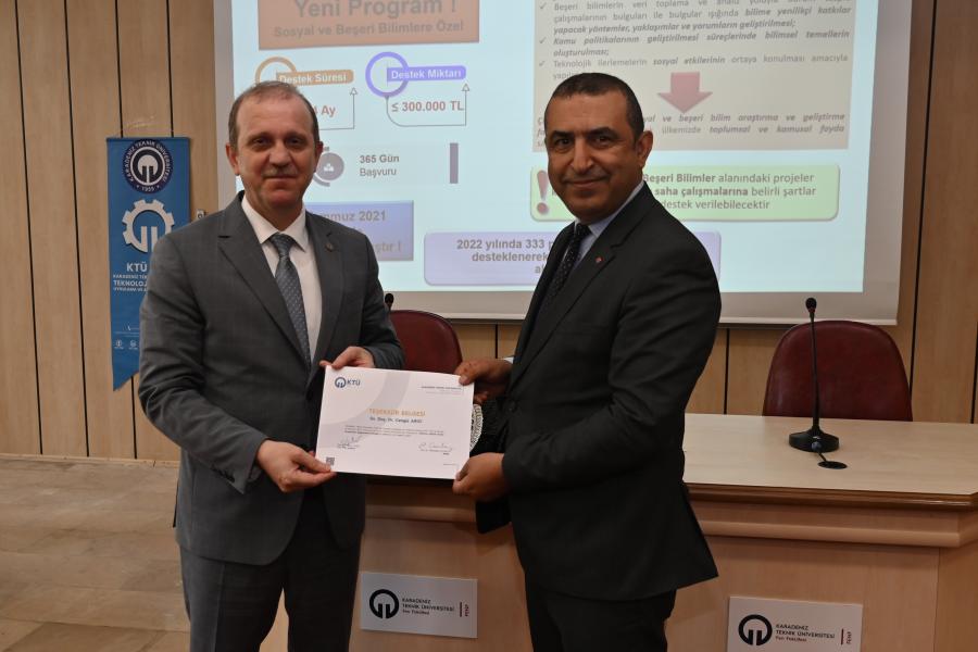 KTÜ TTM ve TÜBİTAK Araştırma Destek Programları Başkanlığı (ARDEB) organizasyonuyla; Üniversitemiz yüksek lisans/doktora öğrencileri, doktora sonrası araştırmacıları ve akademisyenlerine yönelik “TÜBİTAK ARDEB Destek Programları Bilgilendirme Etkinliği” gerçekleştirildi. TÜBİTAK ARDEB Başkan Yardımcısı Doç. Dr. Cengiz ARICI’nın konuşmacı olarak katıldığı etkinlikte TÜBİTAK ARDEB programları hakkında bilgilendirme yapılarak güncel değişiklikler anlatıldı. Etkinlik sonunda Rektörümüz Prof. Dr. Hamdullah ÇUVALCI tarafından Doç. Dr. Cengiz ARICI’ya plaket takdim edildi.