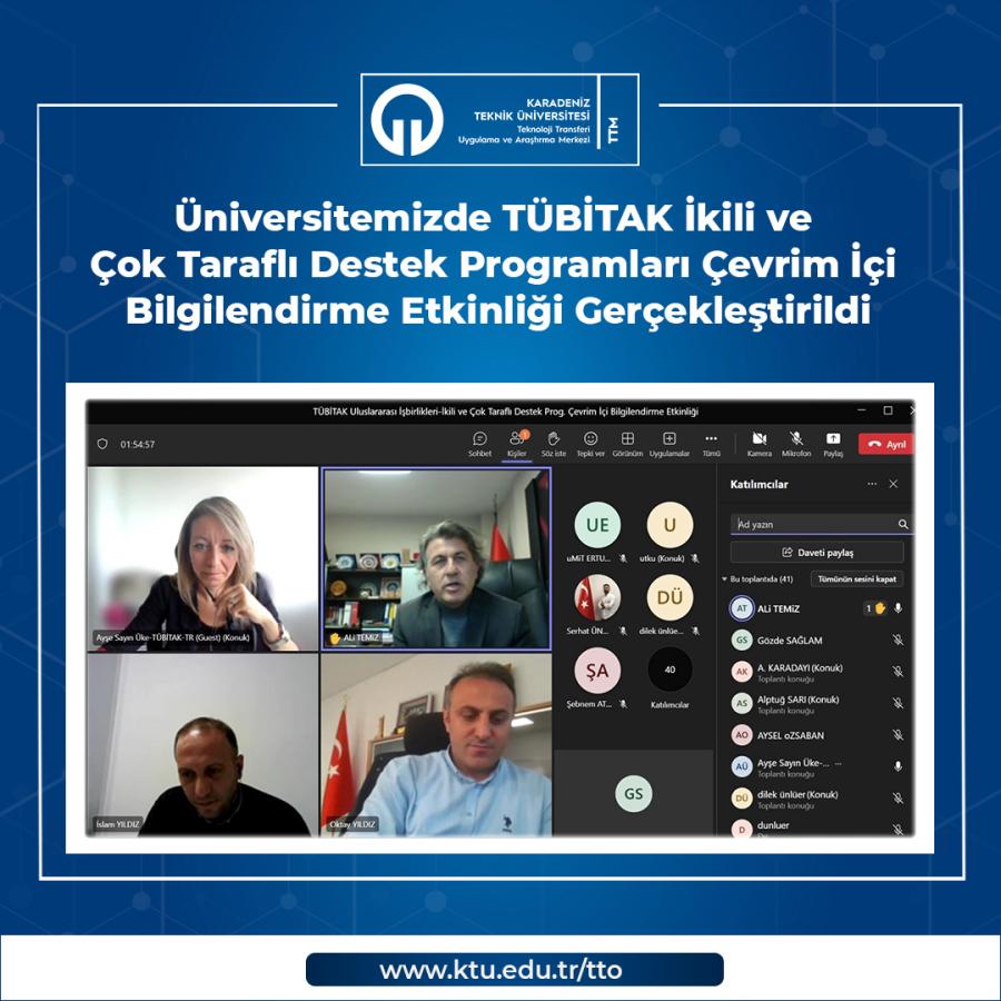 KTÜ TTM ve TÜBİTAK Uluslararası İşbirliği Daire Başkanlığı’nın organizasyonuyla 15 Mart 2023 tarihinde çevrim içi “TÜBİTAK Uluslararası İşbirlikleri-İkili ve Çok Taraflı Destek Programları Bilgilendirme Etkinliği” düzenlendi.