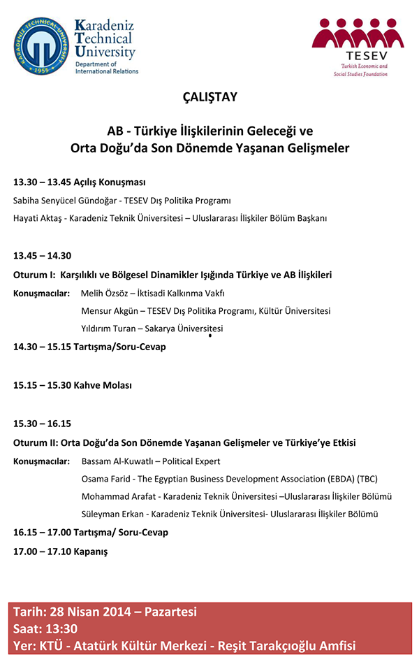 28 Nisan - Pazartesi günü Bölümümüz ve TESEV partnerliğinde "AB - Türkiye İlişkilerinin Geleceği ve Orta Doğu’da Son Dönemde Yaşanan Gelişmeler" konulu bir Çalıştay düzenlenecektir.