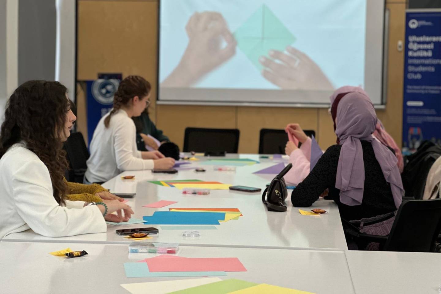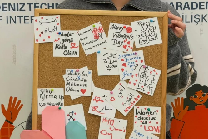 Üniversitemizde faaliyet gösteren Uluslararası Öğrenci Kulübü’nün kadın üyeleri, 8 Mart Dünya Kadınlar Günü kapsamında Dış İlişkiler Ofisi Etkinlik Salonu’nda düzenlenen etkinlikte bir araya geldi. Farklı ülkelerden öğrencilerin katılımıyla gerçekleşen buluşmada, katılımcılar origami çalışması yaparak el emeği hediyeler hazırladı ve birbirleriyle hediyeleşti. Etkinlik kapsamında ayrıca oluşturulan dilek tahtasına kadınların dayanışması, eşitlik ve barış temalı mesajlar yazıldı. Samimi bir atmosferde gerçekleşen etkinlik, uluslararası öğrenciler arasında kültürel paylaşımı ve dayanışmayı güçlendiren anlamlı bir buluşma oldu.