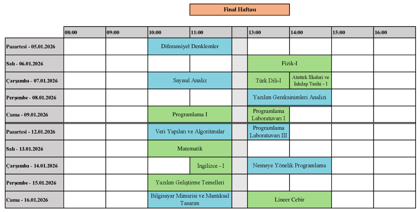 2025-2026 Güz Dönemi final ve bütünleme sınavlarında gün ve saat değişikliği yapılmıştır. Güncel programa buradan ulaşabilirsiniz.