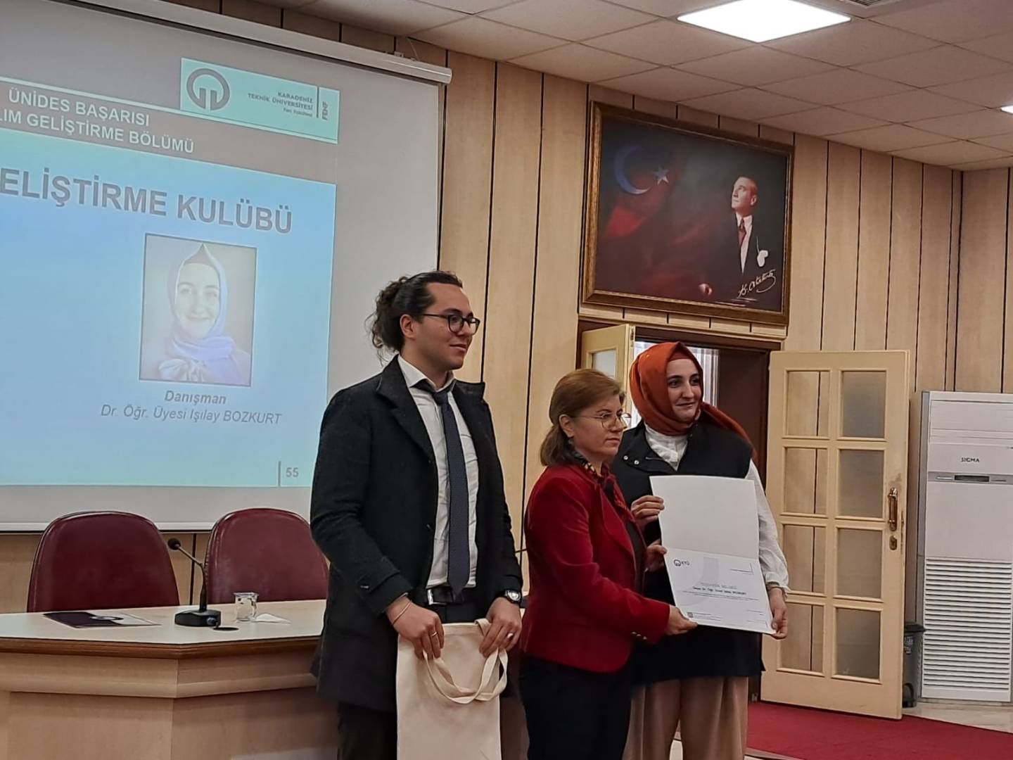 Yazılım Geliştirme Bölümü Kulübü'nün 'Geleceğe Bakış' ve 'Kod Rotası' projeleri, UNİDES kapsamında 200.000 TL hibe desteği aldığından ötürü Fen Fakültesi tarafından teşekkür belgesine layık görüldük. Ödülü projeye danışmanlık yapan Dr. Öğr. Üyesi Işılay BOZKURT ve proje yürütücüsü Murat Can AKYOL almıştır.