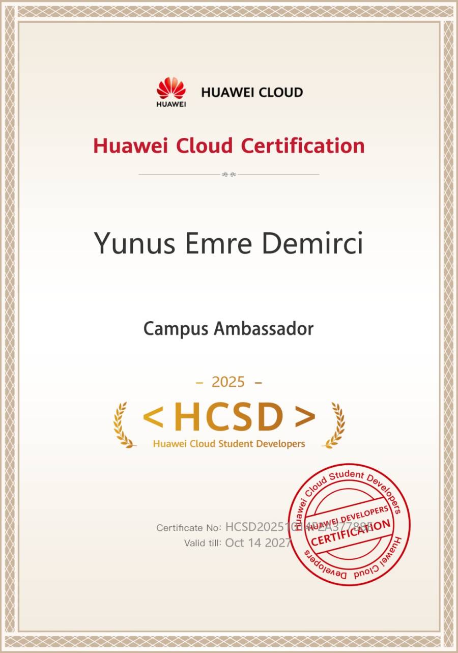 Huawei Student Developer (HSD), üniversite öğrencilerinin teknoloji ve yazılım alanlarında bilgi edinmelerini, sektördeki yenilikleri yakından tanımalarını ve küresel geliştirici topluluklarıyla etkileşim kurmalarını teşvik eden uluslararası bir programdır. Kampüs elçileri, bu yapının üniversitelerdeki temsilcileri olarak, teknoloji odaklı etkinlikler ve topluluk çalışmaları konusunda önemli bir rol üstlenmektedir. Öğrencimiz ayrıca Huawei Cloud Certification alarak bulut teknolojileri alanındaki teknik yeterliliğini belgelemiştir.